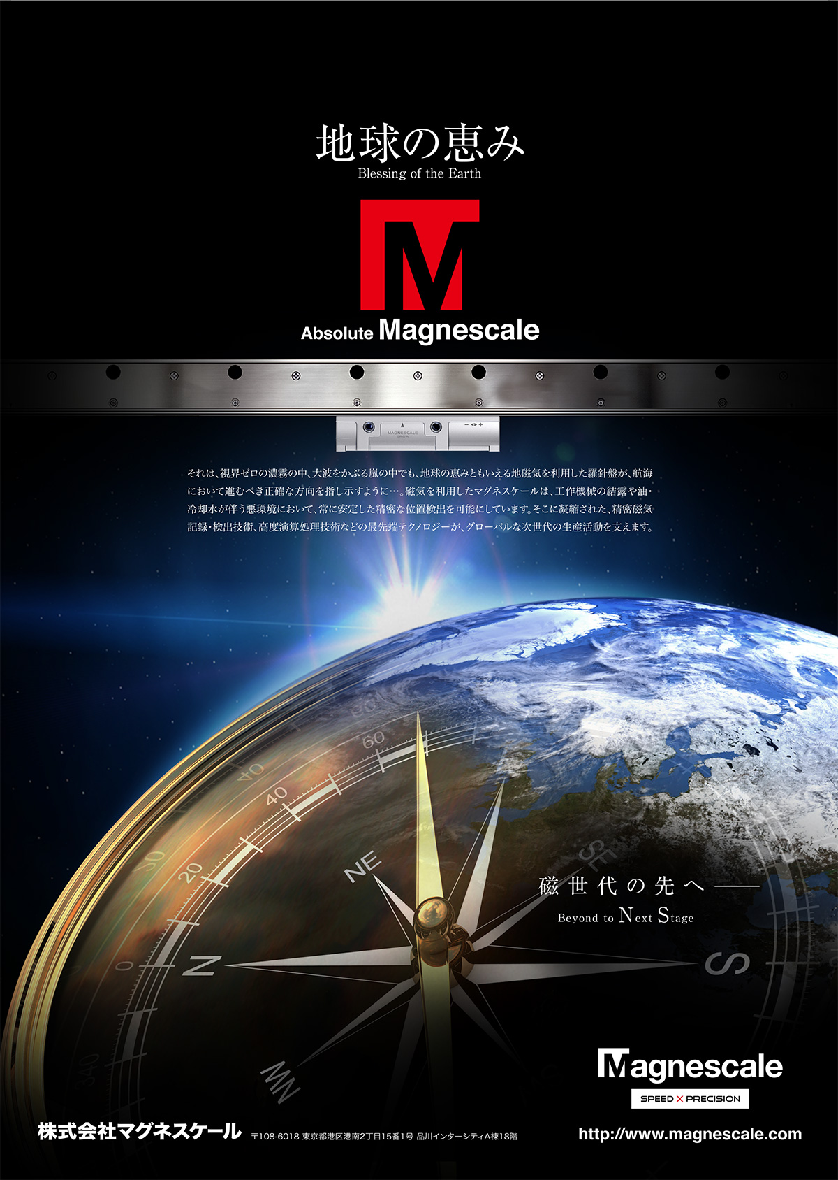 地球の恵みである地磁気を利用し、悪環境の航海でも安定かつ正確な位置を示す羅針盤をモチーフに、同じ磁気を利用した計測機器「マグネスケール」の優位性を表現しました。